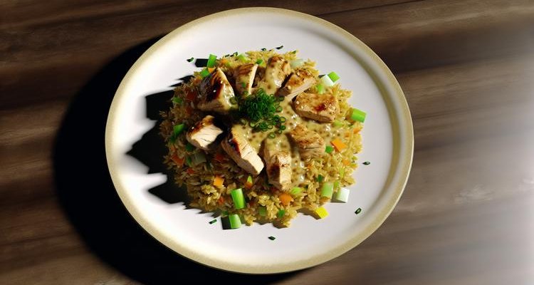 Blackstone hibachi chicken and rice with yum yum sauce on white plate with sesame seeds and green onions